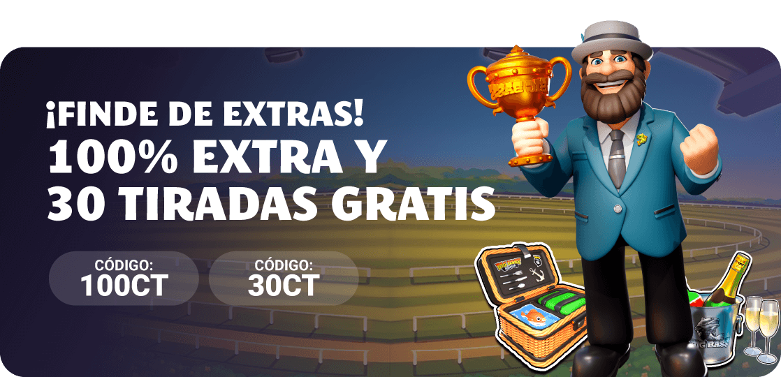 - Con su depósito de 15 euros o más usando el código promocional 30CT el usuario recibirá 30 tiradas gratis en la slot Big Bass Return to the Races.