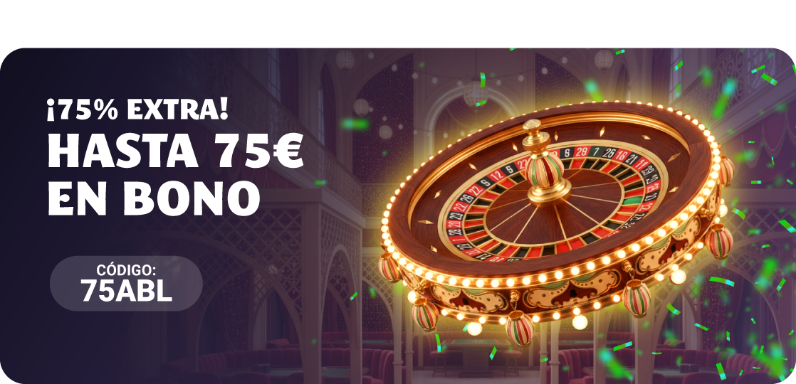Realiza un depósito mínimo de 10€ con el código promocional 75ABL y consigue un 75% extra hasta 75€ en Bono Casino.