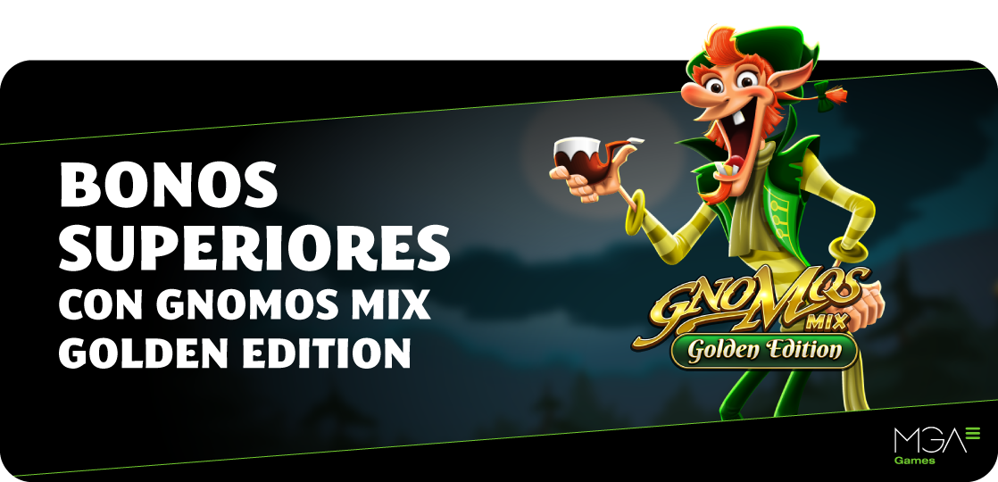- Los 400 primeros jugadores que participen durante el periodo promocional recibirán 5 Bonos Superiores en los juegos de MGA Games, sin necesidad de realizar una apuesta mínima. Además, todos los jugadores que apuesten más de 30€ exclusivamente en el juego Gnomos Mix Golden Edition durante el periodo promocional recibirán 25 Bonos Superiores extra.