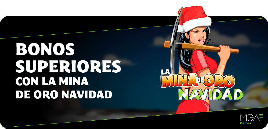 - Los 400 primeros jugadores que participen durante el periodo promocional recibirán 5 Bonos Superiores en los juegos de MGA Games, sin necesidad de realizar una apuesta mínima. Además, todos los jugadores que apuesten más de 30€ exclusivamente en el juego La Mina de Oro Navidad durante el periodo promocional recibirán 25 Bonos Superiores extra.