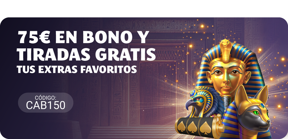 - El usuario que deposite 10€ o más con el código CAB150 recibirá un 150% extra hasta un máximo de 75€ en bono casino y 10 tiradas gratis en la slot Code of Cairo.