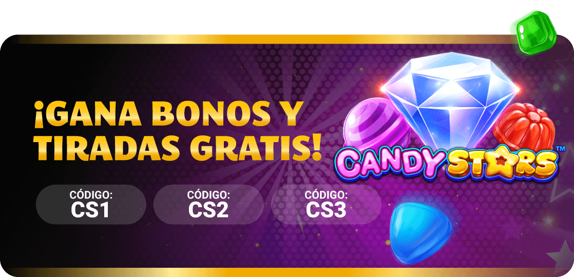 El usuario que realice un depósito de 50€ con el código CS2 recibirá 20 Tiradas Gratis en la slot Candy Starts y 30€ en Bono Casino.