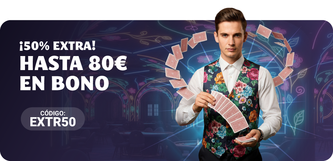 - El usuario que deposite 20€ o más con el código EXTR50 recibirá un 50% extra hasta un máximo de 80€ en Bono Casino.