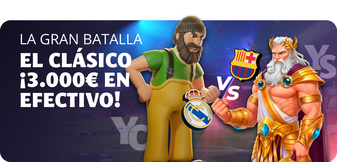 Elige tu bando: YoCasino o YoSports, y participa en esta promoción inspirada en El Clásico. Juega en las slots seleccionadas de Pragmatic Play y acumula puntos por cada euro apostado.