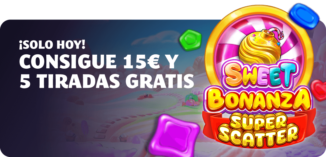 - El usuario que deposite y juegue 25€ o más de dinero real en YoCasino recibirá 15€ en Bono Casino y 5 Tiradas Gratis en Sweet Bonanza Super Scatter.