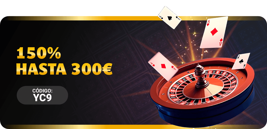 Consigue 150% EXTRA ¡hasta 300€ de bono! Para lograrlo haz un depósito de 10€ o más con el código YC9. ¡Y listo!